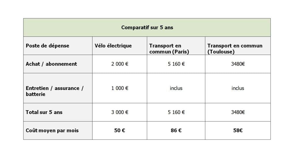 Pour mieux visualiser l’économie réalisée, illustrons la comparaison entre l’achat d’un vélo électrique et l’abonnement au transport public sur une période de cinq ans.